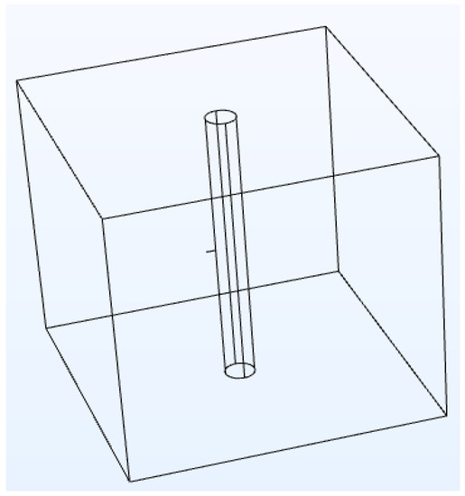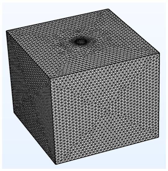 A 3D cubic geometry model was constructed by intercepting a part of the shaft wall and its surrounding rock based on the single-hole grouting model behind the shaft wall established in Section 2.2. The 3D cubic geometry model was used to simulate and explore the diffusion process of single-hole grouting. The overall size of the model shaft was set as 22 × 22 × 22 m, and the shaft diameter was set to 0.95 m. The grouting hole was located near the center of the model shaft wall with a diameter of 0.038 m and a length of 2 m. The geometric model was covered with a free-dissecting triangular mesh generated using the COMSOL Multiphysics software. The number of triangular elements in the constructed grid was 366,355, the maximum cell size of the grid was 0.77 m, and the minimum cell size of the grid was 0.0011 m. The maximum cell growth rate of the elements was 1.2, and the curvature factor was 0.25. The results of the geometric model as well as the mesh generation results are presented in Figure 4 and Figure 5.