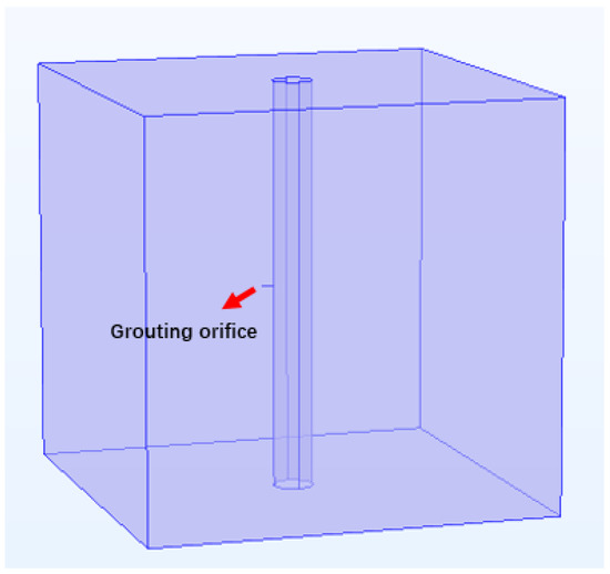 The single-hole grouting test was conducted to explore whether the equipment capacity met the test requirements. In addition, this test was performed to evaluate the grouting difficulty, grouting volume, and grouting pressure parameters. Hydrostatic pressure of the surrounding rock was approximately 1 Mpa, which was the same as that for the multiple grouting holes drilled in the grouting section at a depth of 146 m. Therefore, one grouting hole was used to evaluate slurry diffusion. The grouting section was represented as a single-hole grouting model behind the wall (Figure 3).