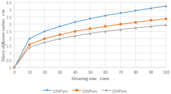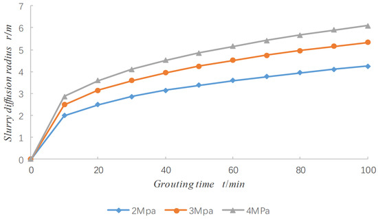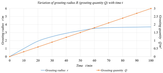 The optimal parameters, including slurry injection pressure at 3 MPa and slurry dynamic viscosity at 20 MPa·s obtained after simulating and evaluating the effects of different factors on slurry diffusion regularity, were used in the simulation test. The expected slurry injection volume of the project was 30 L/min, which was compared with the variation in slurry diffusion radius with time t after optimization (Figure 9).
