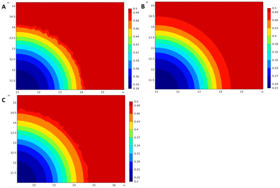 A change in slurry concentration allows for visualization of the difference in diffusion radius r. Analysis using the parametric scanning function in the COMSOL numerical simulation software showed that the volume fraction of solid slurry particles extracted at 10 min intervals varied significantly between 0 and 100 min of grouting time (Figure 10).