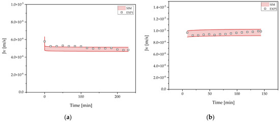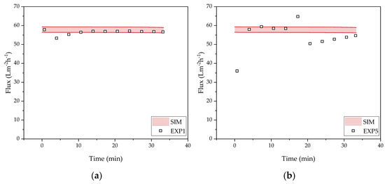 Flux Jv over time for experimental (squares) as well as digital twin prediction (red area) for harvest experiments by ultra-/diafiltration: (a) Experiment 1 (EXP1): 1.3 bar transmembrane pressure (TMP), 2040 s−1 shear rate. (b) Experiment 5 (EXP5): 1.4 bar TMP, 11,285 s−1 shear rate. (c): Experiment 8 (EXP8): 1.3 bar TMP, 6072 s−1 shear rate. (d): Experiment 9 (EXP9): 0.8 bar TMP, 6028 s−1 shear rate.