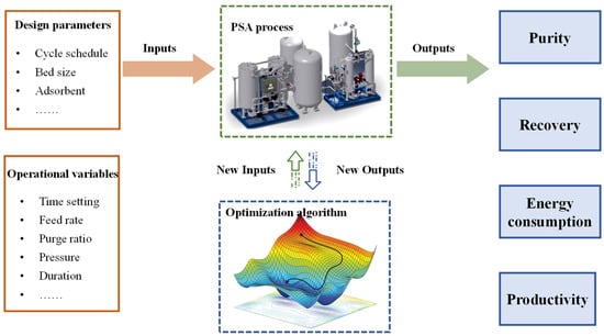 After determining the process model, it is also necessary to optimize the PSA process to find the best design parameters and operating variables to improve process efficiency. The optimization of the PSA process is a multi-objective optimization problem, which generally includes various process performance indicators, such as product purity, recovery rate, production capacity, process energy consumption, etc. For decades, various optimization strategies and algorithms have been continuously developed, which can be roughly divided into deterministic and metaheuristics algorithm. Gradient-based deterministic algorithms include sequential quadratic programming (SQP), reduced space sequential quadratic programming (rSQP), the interior point method, the efficient set method, the trust region efficient algorithm, etc. [,,]. Novel metaheuristic and artificial-intelligence-based optimization algorithms, including the genetic algorithm (GA), particle swarm optimization (PSO), the ant colony algorithm, the annealing algorithm, etc. Among these, GA and PSO are typical metaheuristic algorithms, which have demonstrated superior performance and efficiency in multiple reports [,,]. Currently, the research on PSA process optimization shows a clear trend toward a more intelligent, easier, and integrated direction. The combination of deep-learning technology with artificial-intelligence-based optimization algorithms will be new task for PSA industrial application. In addition, in actual industrial production, there are inevitably some uncertain factors that cause disturbance to the PSA process, such as feed flow, concentration and temperature deviating from the operation set, which make it take a long time to recover, resulting in suboptimal results of the entire process. Therefore, it is necessary to develop and design the control system to minimize impact and achieve stable operation. Researchers have actively explored the control system for a PSA unit, including the proportional-integral-derivative control strategy (PID) and model-predictive control strategy (MPC) [,].