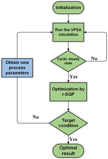 In previous work, a nonlinear programming model such as the quadratic programming (QP) and sequential quadratic programming (SQP) algorithms are commonly used in for the PSA optimization based on the SD model. In order to solve large-scale nonlinear programming problems, which have a large number of equationally constrained equations but relatively low degrees of freedom, the reduced-space SQP (r-SQP) algorithm is proposed. The r-SQP can greatly reduce the amount of calculation and storage capacity of the optimization process through a spatial-decomposition technique that solves the process system in zero space, with relatively small degrees of freedom []. Currently, the algorithm has been successfully applied in nitrogen/methane separation, biogas upgrading, carbon capture, and other processes. Sun et al. [] employed the state-of-the-art reduced space successive quadratic programming (r-SQP) optimization algorithm to find the optimal values of decision variables with additional constraints for N2/CH4 separation, which took nearly 64 h. Ding et al. [] proposed a generic optimization framework, as shown in Figure 3. It contained the discretization and solution of the partial differential equations, the sensitivity of the decision variable, the judgment of CSS, and the choice of the optimization algorithm.
