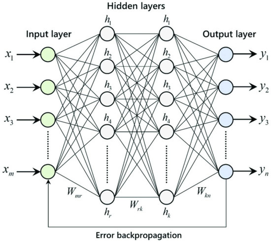 The selection of a suitable and accurate model is critical for a PSA data-driven surrogate model. A deep-learning method along with an artificial neural network (ANN) can fully dig out the most essential laws of process data and quickly establish a surrogate model []. The backpropagation neural network (BP-NN) is frequently used, due to its excellent prediction and fitting capabilities. A typical multilayer feedforward neural network structure is shown in Figure 4. The basic training process is as follows: first, a number of decision variables and objective functions are selected, and then the training samples are obtained from the detailed PSA model. Then, the ANN toolbox in MATLAB is used to take the decision variables of samples as input and the objective function values calculated by the detailed model as output. Finally, the algorithm is allowed to train itself by adjusting the proportion of the training set, validation set and test set. If the fit obtained from the training does not meet the requirements, the percentages of the three sets are changed and retrained. Lee et al. [] trained and tested a dynamic-model ANN for H2 recovery and CO2 capture from the tail gas of hydrogen plants, and they found that the dynamic-model-based ANN could precisely predict the dynamic behavior and optimum performance of an integrated process at a low computational cost.