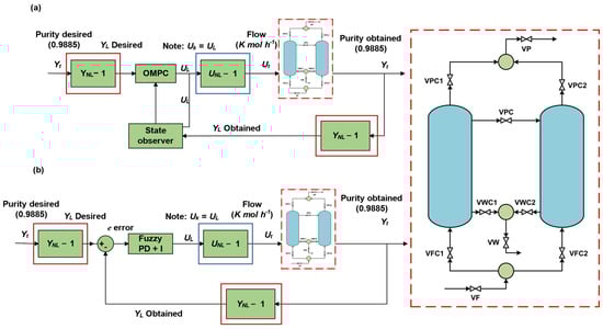 Simulation implementation within the Aspen Plus/Simulink environment of (a) the optimal MPC and (b) fuzzy PD + I to control the adsorption plant cited from Jesse []. UL and YL are the input–output control signals, whereas Ut and Yt are the input–output signals of PSA process. VP, VF and VW are product valve, feed valve and waste valve, respectively. Readapted with permission from Ref. []. Copyright 2020 Elsevier.