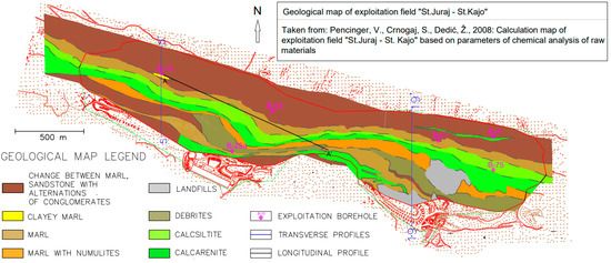 - Pencinger, V.; Ožanić, M.; Crnogaj, S.; Dedić, Ž.; Jurić, A. Study on the Reserves of Mineral Raw Materials for the Production of Cement in the Exploitation Field “St. Juraj—Sv. Kajo ”-Restoration; Croatian Geological Survey: Zagreb, Croatia, 2009. (In Croatian) [Google Scholar]