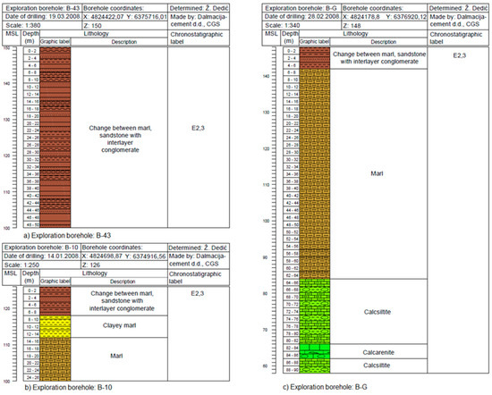 The flysch is a dominant lithology, which is a descriptive term used to denote the facies of marine sedimentary rocks. The facies are characterized by high-powered sections of faunal-poor, thin-layered sediments with gradation stratification, represented mainly by marls, sandy and calcareous shales, and silts rhythmically interlacing with conglomerates, coarse-grained sandstones, and graywacke. A widespread pre-Orogenic sedimentary formation formed by a set of flysch facies deposited in various deflections as a result of the rapid erosion of nearby mountain structures uplifting during the period immediately preceding the main phase of orogeny, or during the erosion of the internal ridges created in the early phases of diastrophism. For example, the flysch layers of the late Cretaceous–Oligocene period along the borders of the Alps, which filled the marginal deflections before the tectonic covers advanced to the north prior to the main (Miocene) phase of Alpine orogeny. It is a term used freely to refer to any sediment having the most lithological and stratigraphic features of flysch, for example, almost any turbidites. Dalmatian flysch can reach at outcrops of up to 700 m thickness [10]. According to [7], in the Lutetian (Middle Eocene) period the depositional areas sunk, causing transgression and fast, variable and generally thick sedimentation of clastics (flysch) in deeper environments, supported by strong tectonics. The flysch [3] is divided into three stratigraphic zones: lower, middle, and upper. Furthermore, the two upper zones have been analysed, and the middle is divided into three lithological members: lower debrites, middle calcarenites, and upper marl [7,8,10,11]. The upper flysch included changes of marl and sandstone with alterations of the conglomerate. The flysch is also named “olistostrome” [11], where the upper flysch is divided into three members: lower, middle (sandstone), and upper (conglomerate), including “clips zone” with large, limy blocks with mud support (a kind of megabed). Based on petrology, clastics are described as the following lithological units [14] based on CaCO3 content: nummulitic (micro) breccia (77–80% CaCO3); calcarenite and calcsiltite (80–95% CaCO3); marly limestone (77–80% CaCO3); limy marl (75–77% CaCO3); marl and clayey marl (65–74% CaCO3); marl with redeposited nummulite (highly variable CaCO3); and alternations of marl, sandstone, and limestone (55–70% CaCO3). This lithological classification, with a correction of the percentage of CaCO3 in nummulitic (micro) breccia, is used today. In the exploited field the strata direction is NW–SE with a dip towards the N–NE of around 30°–40°.