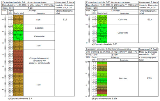 Geological sections: (a) exploration borehole B-45: lithological unit marls and sandstones with alterations of conglomerates; (b) exploration borehole B-10: lithological unit clayey marl; (c) exploration borehole B-G: lithological unit marl; (d) exploration borehole B-A: lithological unit calcsiltite; (e) exploration borehole B-75: lithological unit calcarenite; (f) exploration borehole B-25a: lithological unit debrites.