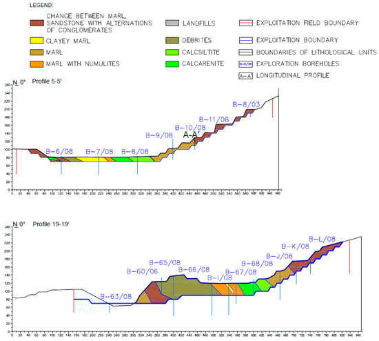 The spatial locations of cross-sections are given in Figure 2. and the details of the cross-sections in Figure 5 (transversal 5–5′ and 19–19′) and Figure 6 (longitudinal A–A’). Transversal revealed the positional of the units in the northern and southern layers, including thin intercalations and longitudinal thinning along the strike.