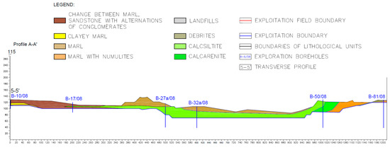 The geological sections showed six lithological units: Unit 1—marl and sandstone with (sometimes thick) alterations; Unit 2—clayey marl; Unit 3—calcitic marl; Unit 4—calcsiltite; Unit 5—calcarenite, and Unit 6—debrites. The average thickness is calculated for all of them (Figure 4).