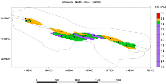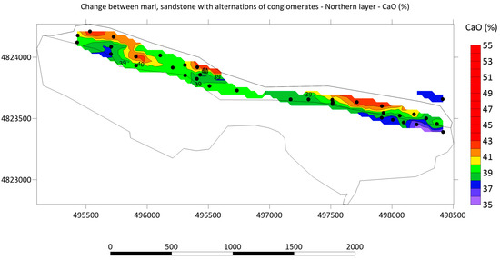 All three lithological units (1, 5, 7) were interpolated with three characteristic maps of oxides CaO and SiO2 and the cement module LSF. Unit 1 (with a layer width of 200–300 m and 36 datapoints) showed that CaO and LSF values slightly decreased toward the south, but values of SiO2 varied by 18–20%. Unit 5 (with a layer width of 50–150 m and 18 datapoints) showed that CaO concentrations were slight, but SiO2 was highly variable throughout the unit. However, the LSF values were gradual, but very variable, reaching even 300 m, which is crucial information for quality control. Analysis showed unit 7 to be the most irregular (with a width of 30–200 m and 7 datapoints), with the largest variations of all three variables on small scales.