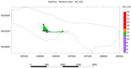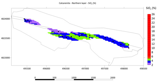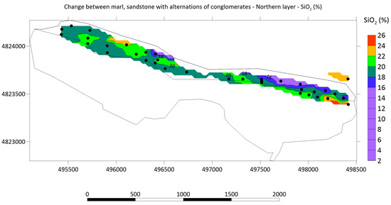 The last three maps were interpolated for unit (7), in the western layer. Interpolation for CaO (%), SiO2 (%) and LSF (−) was carried out using IDW. Power exponent was 2, searching circle 335 m, and anisotropy = 1 (no anisotropy). The maps are given in Figure 15, Figure 16 and Figure 17.