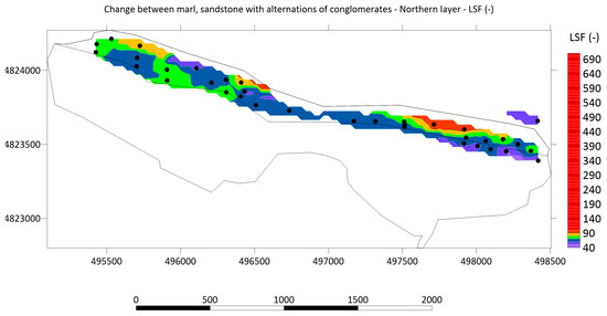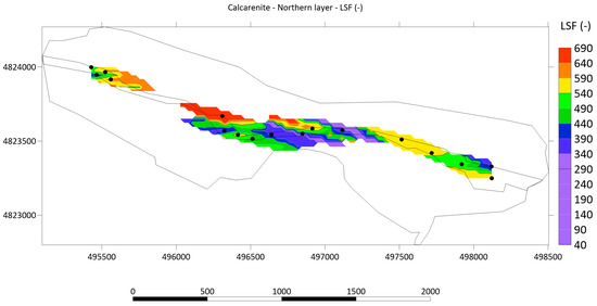 Map of LSF (−) in unit (1), northern layer (boreholes are black dots).