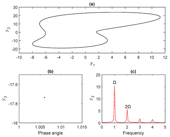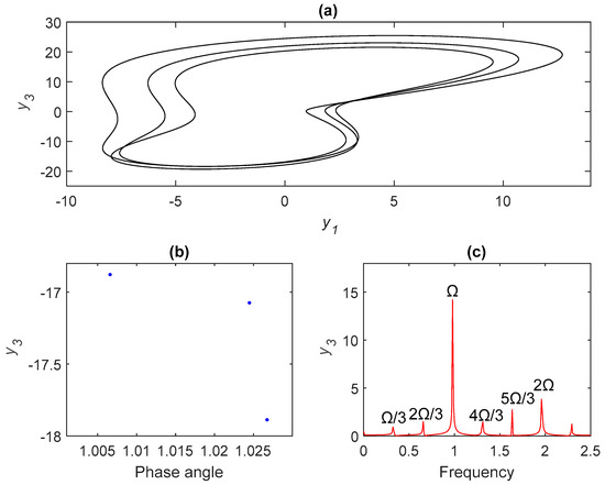 Figure 2a–c illustrates period-1 motion, where σ < 4.08 indicates no chatter vibrations. Figure 3a–c delivers a cascade of period-doubling bifurcations with new frequencies at Ω/2, 3Ω/2, 5Ω/2, …, which generated a series of subharmonic components. Figure 4a–c depicts the period-4 bifurcation, which occurred when σ ≈ 4.195. As shown in Figure 1, a cascade of chaos-inducing period-doubling bifurcations occurred as σ continued to increase, resulting in a chatter vibration and potential instability. Poincaré maps and frequency spectra can be used to characterize the nature of chaotic behavior. Poincaré maps exhibit an infinite set of points referred to as strange attractors used to describe chaotic motion as a continuous frequency spectrum. The appearance of strange attractors and/or a continuous Fourier spectra are strong indicators of chaos [28]. Figure 5 indicates the characteristics of chaotic behavior. The period-three bifurcation occurs in region III in Figure 1, finally resulting in chaotic behavior. Period three is normally associated with chaos of dynamical systems and was first proved in [29]. Figure 6 depicts period-three motion and Figure 7 reveals these characteristics of chaotic behavior in detail.