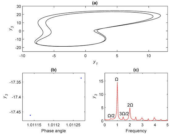 Period-2 motion for σ = 4.15: (a) phase portraits, (b) Poincare maps, and (c) frequency spectra.