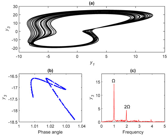 Chaotic motion for σ = 4.32: (a) phase portraits, (b) Poincare maps, and (c) frequency spectra.
