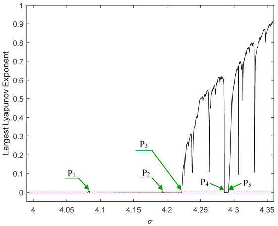 where j is the largest integer satisfying . When σ = 4.1 in Equations (4)–(6), this manner yields a Lyapunov dimension of dL = 1. Since the Lyapunov dimension was an integer, the variable behavior followed a periodic orbit. When the parameter σ increased across point P3, such as at σ = 4.25, it resulted in Lyapunov exponents of λ1 = 0.4994983, λ2 = −0.0029595, and λ3 = −9.3307454, and a Lyapunov dimension of dL = 2.0535. The fact that the Lyapunov dimension is non-integer is evidence of chaotic motion. Accordingly, the Lyapunov dimension for a periodic system is an integer, whereas the Lyapunov dimension for a strange attractor is not necessarily an integer.