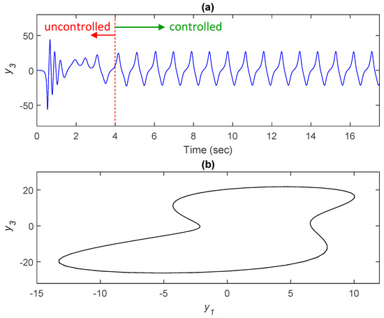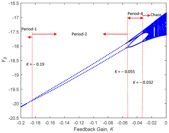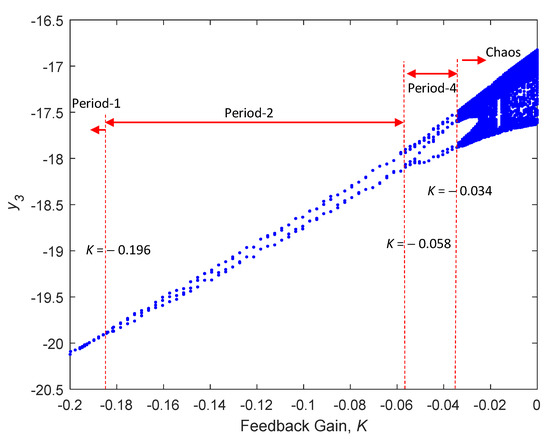 Equations (4)–(6) describes chaotic motion for σ = 4.26 in no state-feedback controller (i.e., K = 0). Figure 9 presents a bifurcation diagram resulting from the addition of state-feedback controller to the right-hand side of Equations (4)–(6). Chaotic motion appeared when K increased beyond −0.032, and a stable period motion appeared when K decreased beyond −0.032. Period-four orbit appeared when K decreased to approximately −0.055 and −0.032. Period-two orbit appeared when K decreased to approximately −0.19 and −0.055. A further decrease in K beyond −0.19 resulted in period-one motion. Stable period-one appeared when feedback gain (K) fell below −0.19. Figure 10 shows how the application of a control signal after 4 s can be used to assert control over chaotic oscillations. Therefore, to suppress the occurrence of chaos, the simple state-feedback controller can be used to disrupt the balance of dynamic behaviors in a chaotic system.