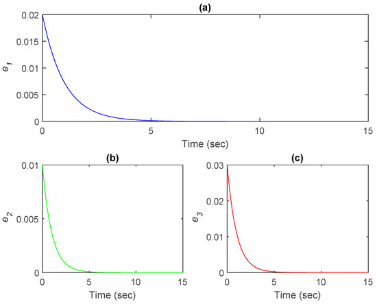 Dynamics of synchronization errors: (a) e1 = v1 − y1, (b) e2 = v2 − y2, and (c) e3 = v3 − y3.