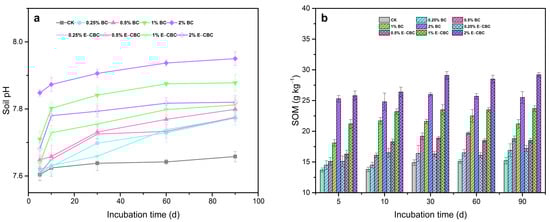 3.2. Effects of Modified Biochar on Soil pH and SOM