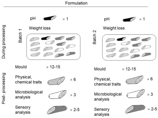 The raw material (meat and fat) used to make the sausages originated from commercially fed and reared pigs of modern crossbreeds. The chilled hind leg muscle meat and backfat (in a 4:1 weight ratio) were minced with a 10 mm mincing plate. Four different formulations were formed, each made in two consecutive batches (i.e., technical replicates), consisting of 12–15 sausages for each of the batches, for a total of 24–30 for each formulation. For the control formulation (CON), the meat batter was mixed with 2.2% curing salt (TKI Hrastnik, d.d., Hrastnik, Slovenia; consisting of sodium chloride with 0.5% sodium nitrite, resulting in a concentration of 110 mg sodium nitrate per kg of meat batter) and 0.2% phosphate mixture according to the manufacturer’s instructions (Sofos 4×, TKI Hrastnik, d.d., Hrastnik, Slovenia; containing 58% di-, tri-, and polyphosphates expressed as P2O5 equivalents). The first experimental formulation (50NI) contained 0.2% phosphate mixture, with the addition of sodium nitrite reduced by 50% (by adding 1.1% pure sodium chloride and 1.1% curing salt). The second experimental formulation (50NA) was prepared in a similar manner with a 0.2% phosphate mixture and a 50% nitrite reduction but with the addition of 225 mg/kg sodium ascorbate (TKI Hrastnik, d.d., Hrastnik, Slovenia). The third experimental formulation (NP) consisted of the addition of 2.2% curing salt (as in the control formulation) but without the addition of the phosphate mixture. The ratios of additives in sausage formulations were by weight. Equal amounts of dried garlic (0.5%), cumin (0.2%), and pepper (0.3%) were used in all formulations. After the batter was thoroughly mixed, it was stuffed into natural casings (3 cm in diameter). The sausages were hung on a rack and dried at a relative humidity of 65–68% and a temperature of 8–9 °C for 24 days until an average weight loss of 45%. During processing, weight loss was monitored weekly. The pH was monitored by measuring it daily during the first week and weekly thereafter using the MP120 pH meter (Mettler-Toledo GmbH, Schwarzenbach, Switzerland). The number of samples used for specific analysis is shown in Figure 1.