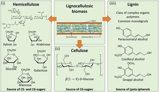 Schematic representation of lignocellulosic biomass and its three main building-blocks: (i) hemicellulose, (ii) cellulose and (iii) lignin (taken from [3]).