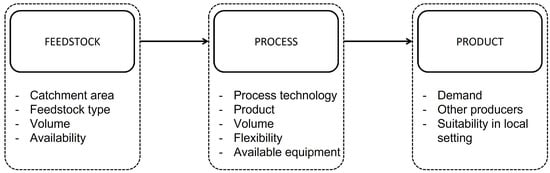 A biorefinery can be simply considered to consist of three parts that are linked together: (i) the input or feedstock part, (ii) the process part and (iii) the output or product part. All three parts come with their own set of distinct (strategical) design choices that need to be considered when designing a biorefinery system (see Figure 2) [18]. Moreover, the choices made in one part of the biorefinery system will inevitably influence the choices that have to be made with regard to the other parts. To illustrate this, when the biorefinery is designed with the ethos of producing a certain product, e.g., biofuel, only a small set of suitable conversion processes and feedstocks will remain eligible for selection.