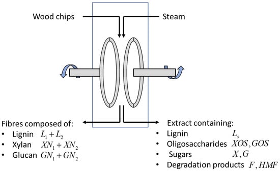 The steam refining model used in this biorefinery setup is a kinetic model developed in [22,23] for the treatment of birch wood at temperatures in the range C, with the concept of a wood biorefinery in view. This implies the selective separation of the three main wood components (lignin, cellulose/xylose and hemicellulose/glucan), which may be further used for the production of high-value components. Consequently, the model includes the three main processes, i.e., delignification, degradation and conversion of xylan and degradation and conversion of glucan, which are briefly described below. The efficiency of the treatment is determined by the experiment temperature and duration. A schematic representation of the steam refining process is illustrated in Figure 4.
