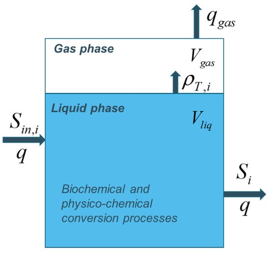 ADM1 is the most complex model describing the anaerobic digestion process. It includes the following conversion steps [21,26]: (i) disintegration of the composite material; (ii) hydrolysis of carbohydrates, proteins and lipids into their corresponding building blocks; (iii) acidogenesis, in which monosaccharides, amino-acids and long-chain fatty acids are fermented and short-chain organic acids, hydrogen, carbon dioxide and ammonia are produced; (iv) acetogenesis, in which various metabolic products of the previous degradation stages are mainly broken down into acetic acid, hydrogen and carbon dioxide, and (v) methanogenesis, in which mainly acetic acid and hydrogen are converted into methane. These conversion steps occur simultaneously and involve a variety of microorganisms. The process takes place in a continuous stirred tank reactor as schematically illustrated in Figure 5: waste is continuously supplied in the influent with the flow rate q (m/day), and an equal flow is withdrawn from the reactor such that the liquid volume remains constant; the produced biogas (composed of methane, carbon dioxide and hydrogen) leaves the reactor with the flow rate .