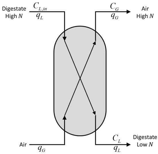 The ammonia stripping process [28,29,30] takes place in a closed vessel, where air is continuously sparged at its bottom and its content is continuously agitated. Ammonia is transferred from the liquid to the air bubbles, which leave the vessel. To facilitate the phase transition, the pH of the system must be increased, which requires the addition of a base. After the stripping, acid is added to re-establish the pH. The air outflow rich in ammonia is supplied to ammonia scrubbing process (not considered here), which allows the retrieval of ammonia as salt that can be used as fertiliser. A schematic representation of the ammonia stripping process is illustrated in Figure 6.