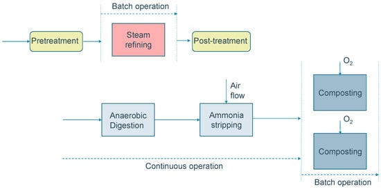 The remaining digestate stream, now with low nitrogen content, still represents a constant and relatively high flow of organic material that can still be further processed. The final step in the proposed biorefinery design consists of a composting step of the digestate combined with the residual wood waste that could not be processed using the steam refining process.Whereas the anaerobic digestion and ammonia stripping are operated in a continuous mode, the composting process is operated as a batch process. Switching from a continuous production line to a batch-operated production line requires a decoupling, often obtained by the usage of holding tanks. Holding tanks can store the continuously produced input of the batch process until the batch reactor is available again. This topic is detailed in the next section.