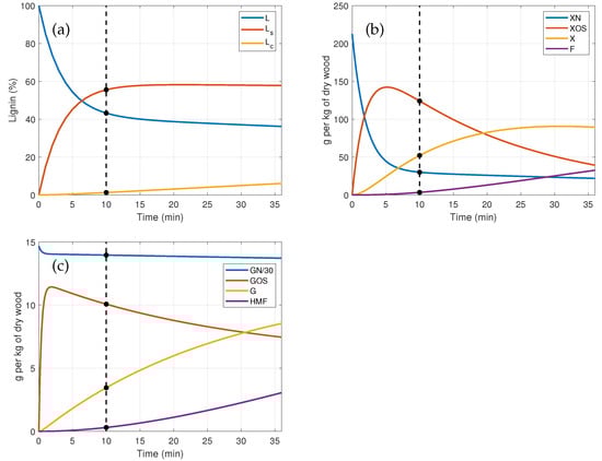 The steam refining conversion is influenced by the temperature and the length of the experiment. Figure 8 shows the evolution of the model states for a temperature C and various experiment lengths. For the evaluation included below, an experiment length of 10 min is selected. This choice is motivated by the fact that no priority is given to any of the products of interest: lignin (solubilised lignin ), fibres (, where each component is the sum of the fast- and slow-degradable fractions) and oligosaccharides (). However, for longer experiments, the degradation of the products of interest occurs: the solubilised lignin degrades to condensed lignin, which is of no practical interest, while the oligosaccharides are converted into degradation products such as furfural (F) and 5-hydroxymethylfurfural ().