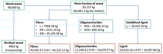 Figure 9 shows the conversion of the wood waste and the amounts of the products obtained, respectively, after steam refining (indicated in blue boxes) and after post-treatment (indicated in red boxes). These amounts are calculated based on the products’ yields corresponding to a treatment duration of ten minutes and the amount of dry matter entering the process. The yields (see Figure 8) are as follows: 43.2% and 55.5% of original lignin content of wood, respectively, for the lignin remaining in the solid phase (L) and the solubilised lignin (), 30 g/kg dry matter and 418.7 g/kg dry matter, respectively, for the xylan () and glucan (), 124 g/kg dry matter and 10 g/kg dry matter, respectively, for xylo-oligosaccharides () and gluco-oligosaccharides (). It is assumed that during postprocessing, 3% of fibres and 5% of oligosaccharides are lost. Note that the extract contains also monosaccharides (xylose and glucose) and can be used as a waste stream to feed another process or can be processed by anaerobic digestion.
