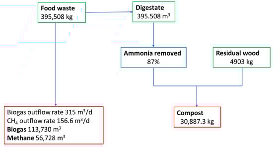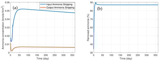 The entire food waste collected throughout the year is processed by anaerobic digestion. Since this waste is available continuously, the simulation of the anaerobic digestion process is also performed for one year, with a constant supply of waste equal to 1083.6 kg/day. Similar to [24], it is assumed that the waste has the water mass, which implies that the digestor is operated with a constant flow m/day. Since low hydraulic retention times (defined as the ratio between the liquid volume and the feed flow rate) may lead to the reactor wash-out, in this simulation, the reactor liquid volume is selected as m and the gas volume is chosen as m. Figure 10 shows the obtained outflow rate of biogas, the outflow rate of methane, the volumetric production of methane and the composition of biogas for the entire operation span. The effluent of the digestor is sent to the ammonia stripping process. The same liquid volume and the same feed flow rate as for the anaerobic digestion is assumed for this process. Air is continuously supplied such that efficiency of the removal in the range is achieved. Figure 11 illustrates the influent and effluent ammonia concentrations and the corresponding removed amounts.