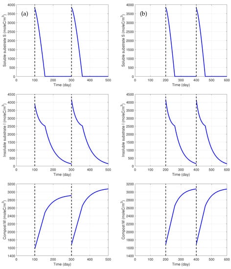 - The concentrations of the soluble substrate, insoluble substrate and inert material entering the composting process are respectively given bywhere x, y and z (mol C/L) are respectively the concentrations of the soluble substrate, insoluble substrate and inert material in the tank at time instant , i.e., , and given by (17). In (17), , and are respectively the concentrations of the soluble substrate, insoluble substrate and inert material in the low-ammonia digestate entering the tank, which are calculated at each time instant using the conversion coefficients shown in Table 3. The coefficients in (18)–(20) (mol C/kg wood) are calculated based on data in Table 2.