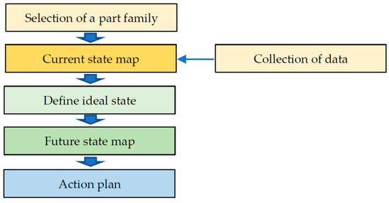 Previous studies show that value chain implementation and management is critical [28]. VSM enables a constant flow of products and services to the customer [29]. For example, firms have used VSM to identify waste and inefficiency in new product development [30], healthcare services [31,32], sales processes [33], and environmental sustainability [34,35]. The use of VSM, as shown in Figure 1, can be divided into five steps: (1) selection of a part family; (2) current state map (including the collection of data); (3) define ideal state; (4) future state map; and (5) action plan [36].