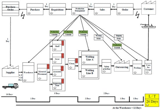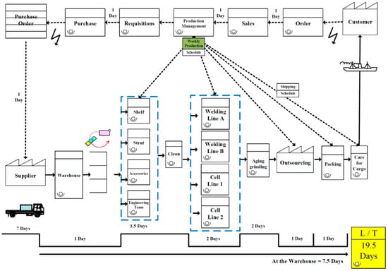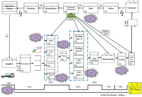 VSM begins with the customer requirements, and follows the procedures of the production process [53]. It highlights each workflow stage in reducing various forms of waste [8]. VSM is simple, and all stakeholders—from suppliers to operators to management to the customer—can easily grasp it. Because of this, important issues and their solutions can be identified and addressed by the production team [54,55,56]. Using the abovementioned mapping tips, we drew the current flowchart of Company S, as shown in Figure 2. We then identified the production bottlenecks in Figure 3 through brainstorming with the improvement team of Company S.