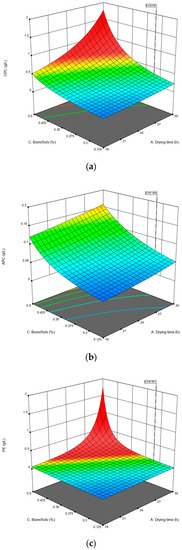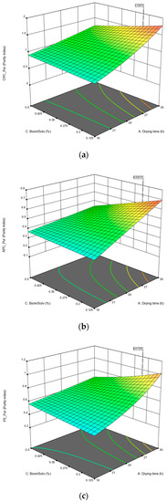 The different surface responses (three-dimensional plots) obtained from the extraction of C-PC, APC, and PE are shown in Figure 1. According to the results, a high biomass/solvent ratio of up to 0.5% w/v coupled with 30 h of drying using a food-grade dehydrator maximizes the extraction of the studied PBPs.