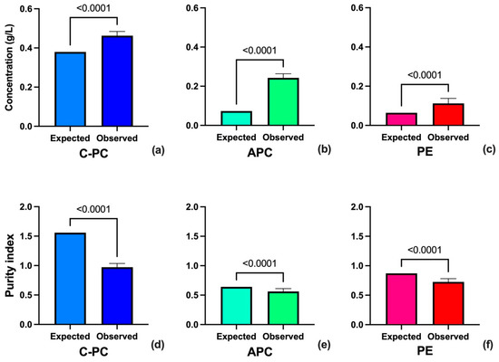 Unpaired t-test between the expected and expected results from extraction (a–c) and purity (d–f) of C-PC, APC, and PE.