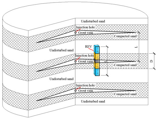For the fracture–compaction grouting mode in sand layers, the grouted body is composed of three different regions, grout vein, compacted sand and undisturbed sand. As shown in Figure 5, several sand grouting projects of Qingdao metro line indicate that grout veins are approximately parallel with each other. Consequently, the performance of the grouted body is anisotropic. Performance of the grouted body in a direction parallel to grout veins is different from that in a direction perpendicular to grout veins. Besides, due to decay of the grout vein thickness from the injection hole to diffusion front, the grouting effect is inhomogeneous and decreases from the injection hole to diffusion front.