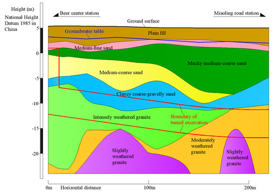 In the influential area for the tunnel, the groundwater table is 1~4 m deep and strata mainly involve medium-coarse sand, clayey coarse-gravelly sand, intensely weathered granite and moderately weathered granite. Clayey coarse-gravelly sand with a thickness of 0.5~2 m is exposed in the upper semi-section of the tunnel face in the range of profile number 39 + 253~39 + 413 m, as shown in Figure 8. In the lower semi-section of the tunnel face, intensely and moderately weathered granite is exposed. The compressive strength of strata in the upper and lower semi-section of the tunnel face is listed in Table 2. The strata in the lower semi-section of the tunnel face have well stability in excavation process. However, there exists a huge risk when excavating the upper semi-section of the tunnel face. Clayey coarse-gravelly sand exposed in the roof arch of tunnel has almost no self-stability due to being water-saturated and having a loose structure. Furthermore, the tunnel is subjected to a heavy dynamic load due to large vehicle flow in the overlying urban road. Therefore, there exists a huge risk of inrush of sand and water when affected by excavation disturbance.