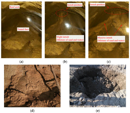 When the tunnel excavation exposed clayey coarse-gravelly sand in the roof arch, small fall-block and seepage started to appear. Subsequently, an inrush accident of sand and water happened at profile number 39 + 253. The process of inrush of sand and water is shown in Figure 9a–c. After formation of the free face, a slight inrush occurred in the roof arch. A few minutes later, a massive inrush occurred with a mixture of sand and water outpouring into the tunnel. The mixture of sand and water is shown in Figure 9d and the saturated sand has absolutely no self-stability. More and more strata of sand were lost in the inrush process. Eventually, there existed a subsidence of the ground surface due to stratum loss, as shown in Figure 10e.