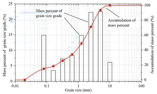 There are several characteristic indexes of sand, which are related to grouting diffusion process and reinforcement effect [7,11,25]. The characteristic indexes of sand mainly involve grain size distribution, cohesive soil content, relative density and in situ stress. Grain size distribution, cohesive soil content and relative density of the sand layer can be measured by laboratory testing. In situ stress can be measured by in situ tests or estimated by the buried depth of the projects.