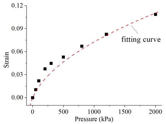 Based on the analysis above, calculation of fracture–compaction grouting diffusion involves a process of grout flow and sand compaction. The compaction process of sand is determined by the compressive force applied by grout, which is equal to grout pressure, and the compaction nature of the sand layer. The compaction nature of the sand layer can be characterized by the relationship between strain ε and pressure p. This relationship can be described by equation ε = f(p) and measured by a confined compression test. In a real fracture–compaction grouting diffusion process, the grouting radius can reach tens of meters and fracture width can reach merely a few centimeters. There is a difference of several orders of magnitude between the grouting radius and fracture width. Therefore, the direction of sand compaction can be considered perpendicular to the fracture direction. In addition, the compaction process of the sand layer can be considered according with the lateral confinement condition approximately. As shown in Figure 4, within the influence range of grouting, there are grout zones in the fracture and compacted zones on both sides of the fracture. Without the influence range of grouting, there is an undisturbed zone which is not compacted in the grouting process. Fracture width is equal to the compaction deformation amount of the sand layer on both sides of the fracture and can be expressed as: