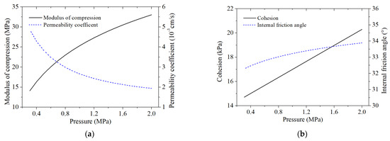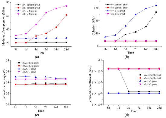 As shown in Figure 15, in ages of 8 h~28 d, the modulus of compression in two directions of C–S grout is higher than that of cement grout with a gap of 7~30 MPa. Cohesion in two directions of C–S grout are higher than that of cement grout, with gap of 12~30 kPa in perpendicular direction and 1.5 kPa in parallel direction. The permeability coefficient in two directions of the C–S grout is 28~37% lower than that of cement grout. Although the long-term performance of cement grout calculus is better than C–S grout, C–S grout is better than cement grout in terms of reinforcement effects during early and late ages of the grouted body, due to the thicker grout vein and higher compaction degree when using C–S grout.