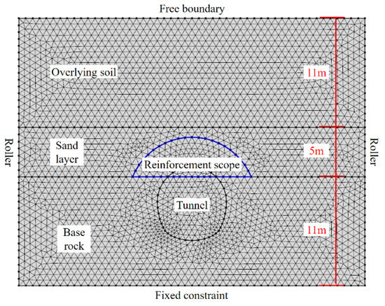 COMSOL Multiphysics, Stockholm Sweden, an FEM software, is used to analyze the tunnel stability after the grouting operation. A two-dimensional model is adopted in the numerical simulation. Boundary conditions and mesh generation of the calculation model are shown in Figure 17. Parameters of the overlying soil and base rock from the document of the engineering geological investigation are used in calculation. Parameters of the sand layer and reinforcement scope from Table 6 are used in calculation. Due to the fact that the anisotropic performance of the grouted body cannot be analyzed in COMSOL Multiphysics, the average performance parameters after the grouting operation in Table 6 are used as parameters of reinforcement scope. The Mohr–Coulomb criterion was used in numerical modeling.
