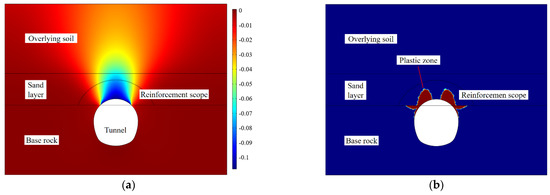 Calculation results of tunnel stability are shown in Figure 18. Vertical settlement of the tunnel after excavation is concentrated in the region of the roof arch. The maximum value of vertical settlement is 10.7 cm, which can be considered as a safe value. The plastic zone is represented by the red zone in Figure 18b, which is mainly distributed in the region near two spandrels of the tunnel. Most of the plastic zone is located within the scope of grouting reinforcement, and there is no extension of the plastic zone in the undisturbed sand layer. Therefore, the surrounding rock of the tunnel can be considered stable.