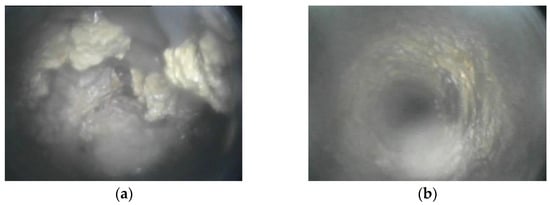 Stratum integrity and permeability after the grouting operation can be acquired from checkholes. After the grouting operation, nine checkholes were drilled in grouting reinforcement scope 24 h later. There is no or little water flow in the checkholes after the grouting operation, with permeability coefficient smaller than 1 × 10−4 cm/s. Performance of impermeability of sand layer meets the requirement of water outflow in tunnel. Borehole televiewer was used before and after the grouting operation to intuitively inspect stratum integrity. Results of the borehole televiewer are shown in Figure 20. Before the grouting operation, stratum integrity is poor, with much crushed stone in the checkhole. After the grouting operation, stratum integrity is clearly improved with no crushed stone in the checkholes. The grouted body has acquired self-stability. The reinforcement effect of grouting on the sand layer is significant.
