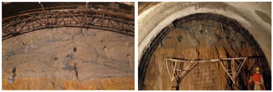 After excavation, the grouted body is exposed in the tunnel face as shown in Figure 21. The grouted body exists in the form of grout veins, proving that the judgment of grouting mode in this project is right. There are a large number of grout veins and no seepage of water in the sand layer. The sand layer is stable enough to guarantee excavation safety during the period from the blasting operation to completing primary support.