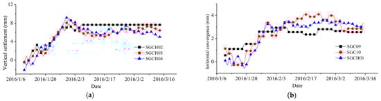 Monitored tunnel deformation. (a) Vertical settlement. (b) horizontal convergence.